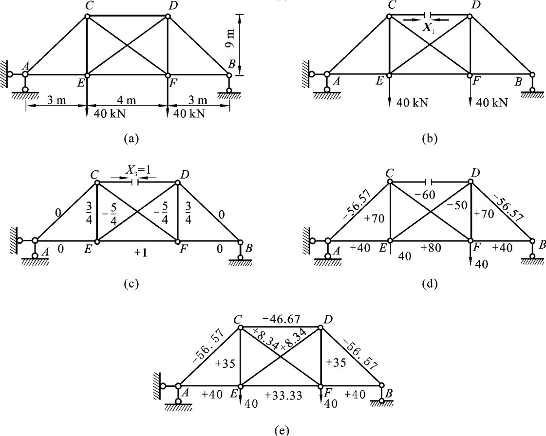 (2)计算系数和自由项时,注意系数中应包含切断链杆的轴向变形影响,因链杆已切断,自由项中的链杆轴向变形为零。