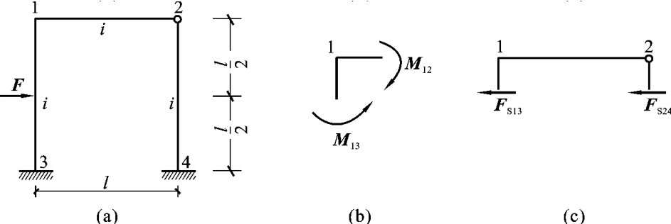如图6-62(a)所示的刚架,用位移法求解时有两个基本未知量:刚结点1的转角位移Z1和结点1、2的水平位移Z2。根据结点1的力矩平衡方程∑M1=0及横梁部分的投影平衡条件∑Fx=0,可写出两个方程