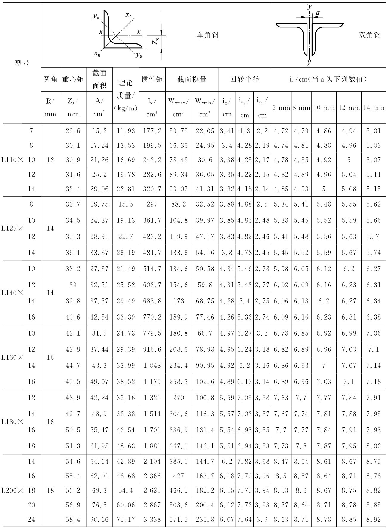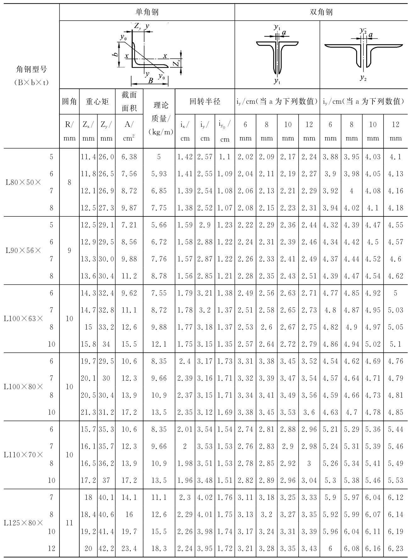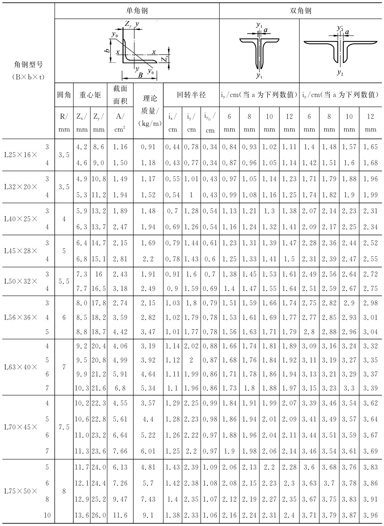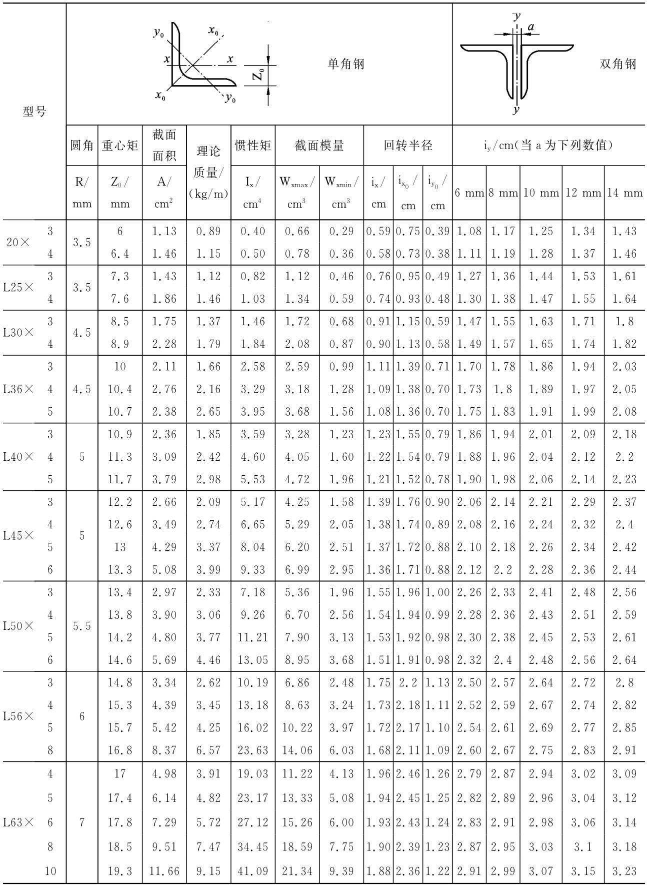 注:一个角钢的惯性矩Ix=Ai 2x,Iy=Ai 2y;一个角钢的截面模量Wxmax=Ix/Zx,Wxmin=Ix/(b-Zx);Wymax=IyZy,Wymin=Iy (b-Zy)。