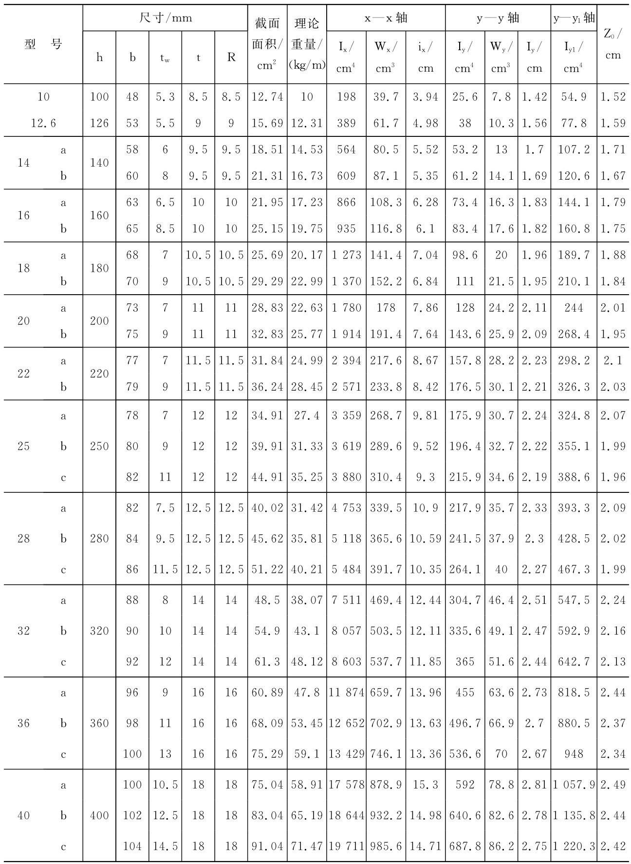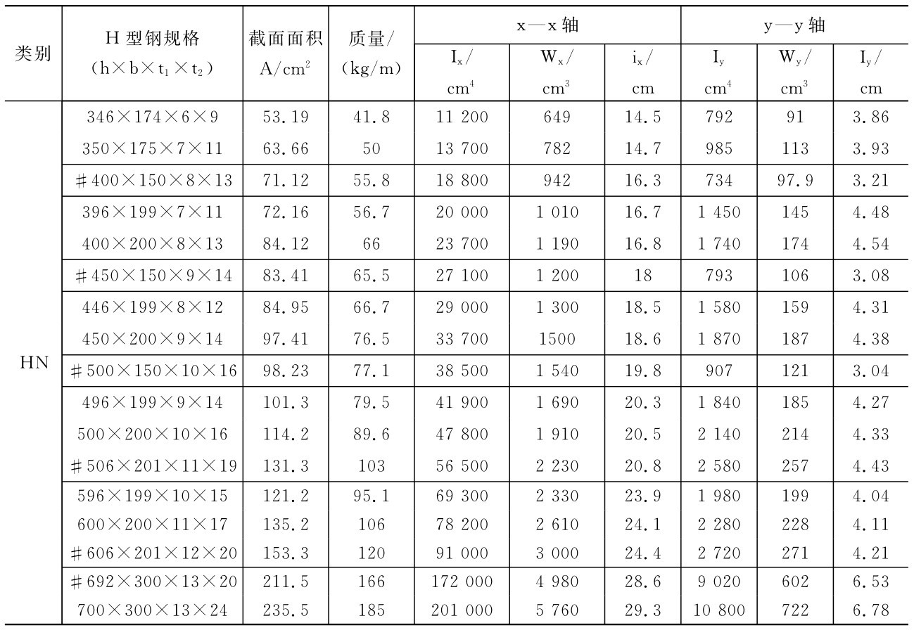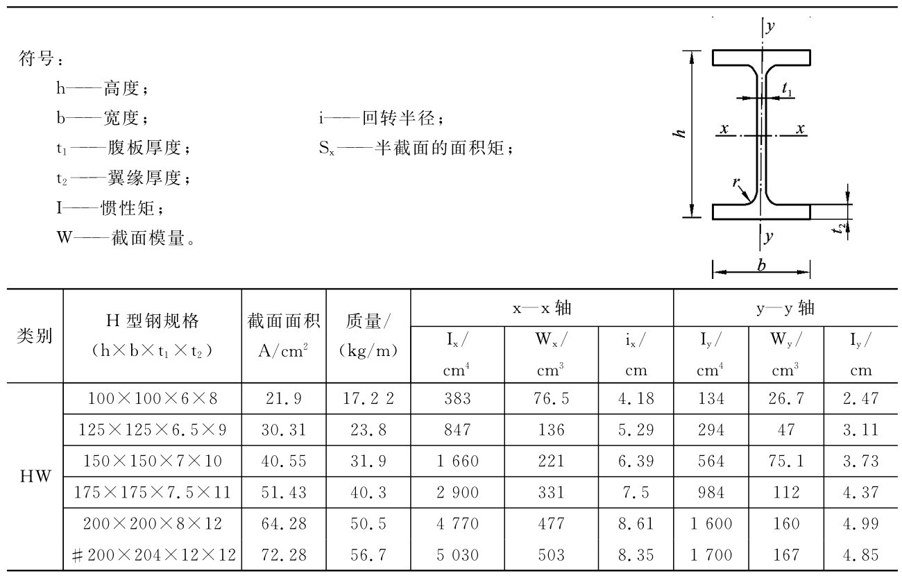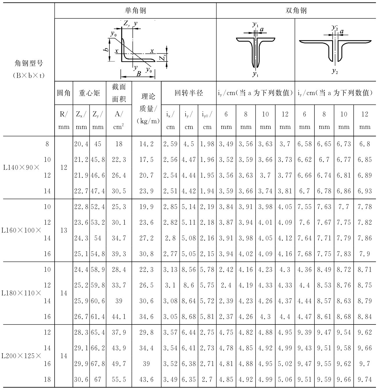 注:一个角钢的惯性矩Ix=Ai 2x,Iy=Ai 2y;一个角钢的截面模量Wxmax=Ix/Zx,Wxmin=Ix/(b-Zx);Wymax=IyZy,Wymin=Iy (b-Zy)。
