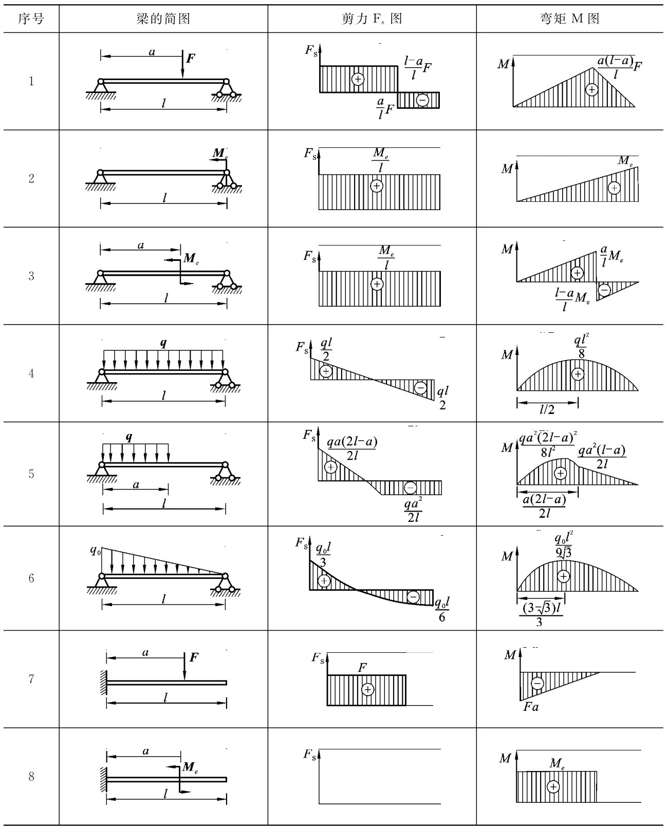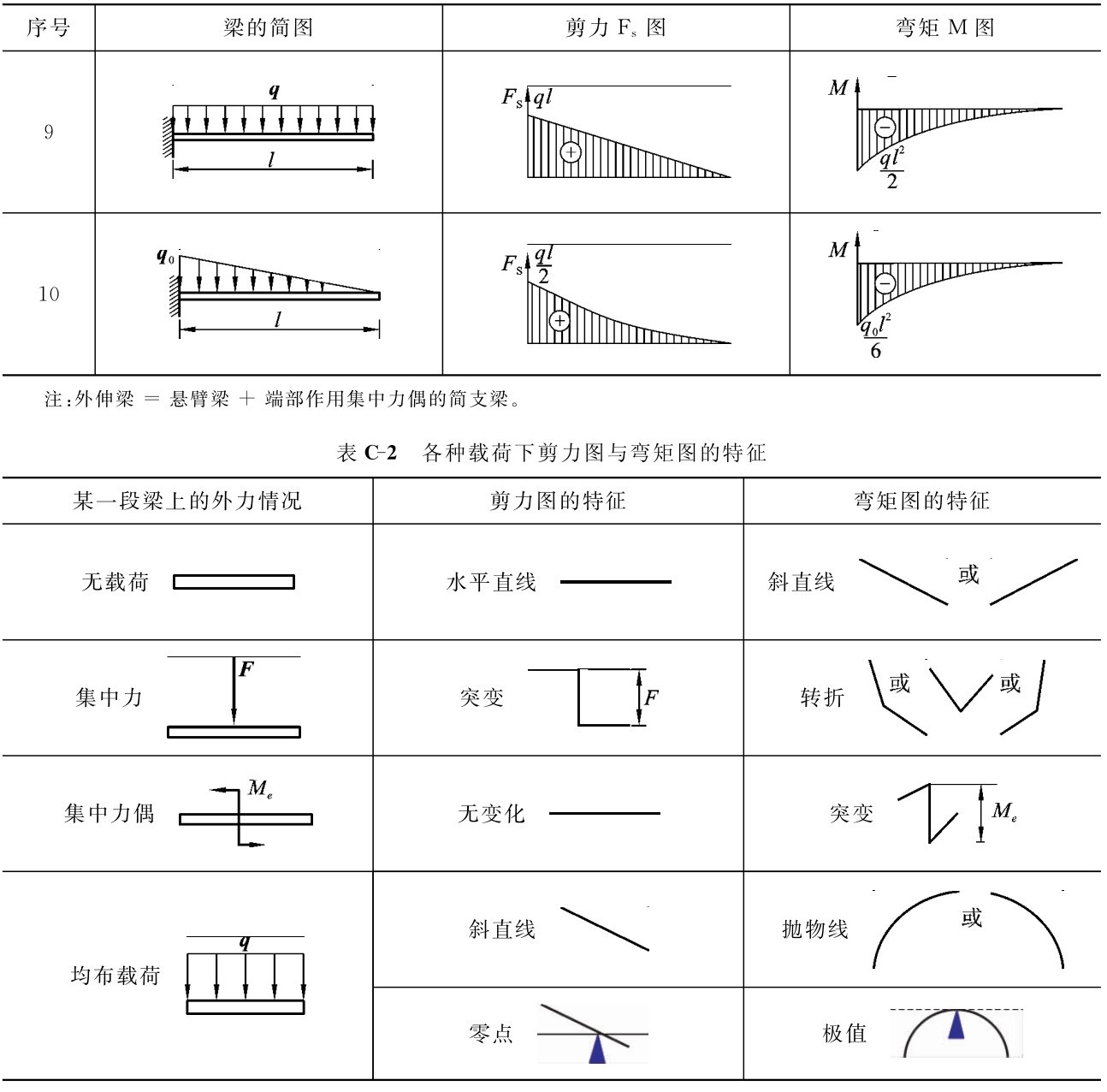 表C-1 简单载荷下基本梁的剪力图与弯矩图