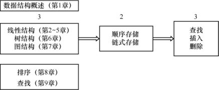 我们可以参看书中目录,脉络就会非常清晰。第1章即数据结构基本概念的介绍,第2~5章线性结构、第6章树、第7章图是重点章节,第8章和第9章排序和查找是重要的数据运算技术,也是非常重要的。