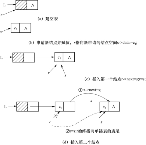 由头插法产生的单链表是逆序的,每次都让新来的结点在第一的位置上。下面介绍另一种建立方法尾插法,就是新来的结点都插在终端结点的后面,该方法是将新结点插到当前链表的表尾上。为此需增加一个尾指针r,使之始终指向当前链表的表尾,如图2-16所示。