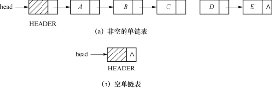 根据问题的需要,有时在单链表的第1个结点之前,还可附设一个称为“表头结点”的结点HEADER。表头结点的信息域可以不存储任何信息,也可以存储标题、建表日期、建表人、表长等信息。表头结点的结构和链表中结点的结构通常是一致的,其指针域存储第一个结点的首地址。若线性表为空表,则该域的值也为空“∧”,图2-12所示为带表头结点的单链表。注意,此时单链表的头指针head指向表头结点HEADER。