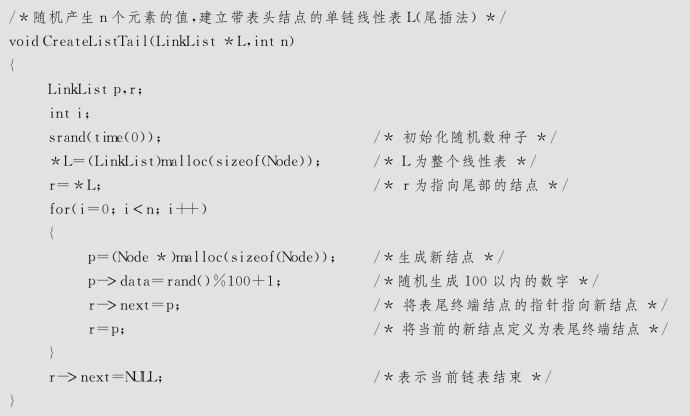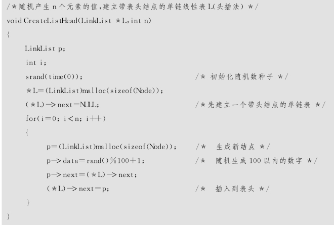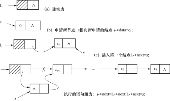 设单链表的初始状态为空,利用标准函数malloc(sizeof(elementype))依次建立线性表中各元素结点,并将它们逐个插入到链表中,插入方法有两种,一种是头插法,即依次将新结点都插到表头结点之前;另一种是尾插法,即每次都将新元素插到表尾。