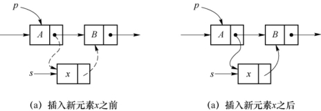 在已知结点后面插入新的结点的操作如图2-13所示,设指针p指向结点A,指针f指向将要插入的新结点x,x插在线性表两个数据元素A和B之间,这时只要修改两个指针即可。上述指针的修改用语句描述为: