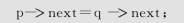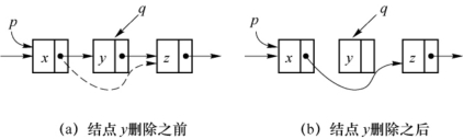 删除已知结点后面的数据元素操作如图2-14所示,若要删除线性表中元素y,则仅修改一个指针。图中p为指向结点x的指针,此时指针的修改用语句描述为: