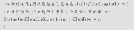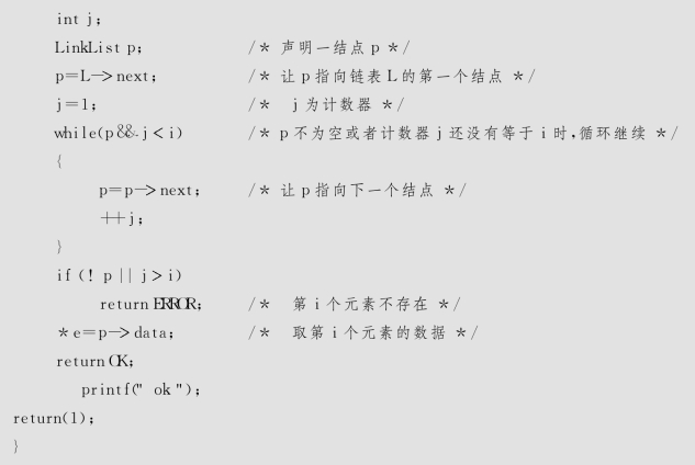 取单链表中任意元素,若该元素存在,则查找成功,返回其值及成功标志;否则,或者为空表,或者表中没有该结点。与顺序表不同的是,链表中结点的地址不能通过公式直接计算,必须从表头开始顺着链逐个结点查找。