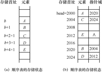 例如,设有一个包含5个元素(A,B,C,D,E)的线性表,其顺序结构和链式结构的存储状态如图2-10所示。