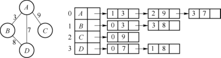 以上所讨论的邻接表所表示的都是不带权的图,如果要表示带权图,可以在表结点中增加一个存放权的字段,其效果如图7-19所示。