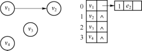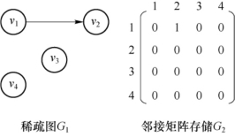 图的邻接矩阵表示法虽然有其自身的优点,但对于点比较多,边很少的稀疏图来讲,用邻接矩阵方法会造成存储空间的极大浪费。如图7-14所示,我们要将此图用邻接矩阵法存储,可以看到,只有一条弧存在,没有其他弧,这些空间全部都浪费了。