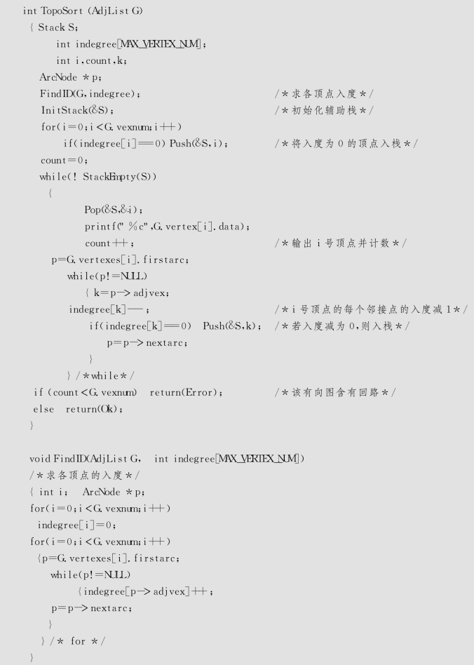 若要算法实现拓扑排序,因为要删除顶点,所以用邻接表存储比较方便。入度为零的顶点即没有前趋的顶点,因此我们可以附设一个存放各顶点入度的数组indegree[],于是有: