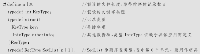 在本章的讨论中,设待排序的一组记录以上述第一种方式存储,且为了讨论方便,设记录的关键字均为整数。即在以后讨论的大部分算法中,待排记录的数据类型设为: