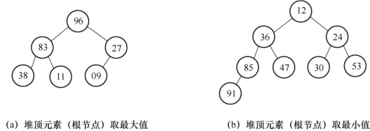 若将和此序列对应的一维数组(即以一维数组作此序列的存储结构)看成是一个完全二叉树,则堆的含义表明,完全二叉树中所有非终端结点的值均不大于(或不小于)其左、右孩子结点的值。由此,若序列{k1,k2,…,kn)是堆,则堆顶元素(或完全二叉树的根)必为序列中n个元素的最小值(或最大值)。例如,下列两个序列为堆,{96,83,27,38,11,09}和{12,36,24,85,47,30,53,91}对应的完全二叉树如图8-11所示。