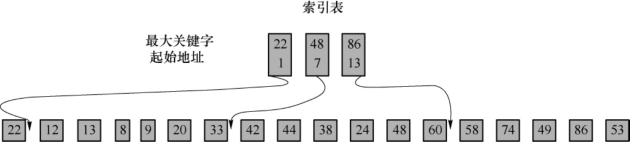 索引顺序表是顺序查找的一种改进算法,又叫分块查找。在此查找法中,除表本身以外,尚需建立一个“索引表”。例如,图9-2所示为一个表及其索引表,表中含有18个记录,可分成三个子表(R1,R2,…,R6)、(R7,R8,…,R12)、(R13,R14,…,R18),对每个子表(或称块)建立一个索引项,其中包括两项内容:关键字项(其值为该子表内的最大关键字)和指针项(指示该子表的第一个记录在表中的位置)。索引表按关键字有序,则表或者有序或者分块有序。所谓“分块有序”指的是第二个子表中所有记录的关键字均大于第一个子表中的最大关键字,第三个子表中的所有关键字均大于第二个子表中的最大关键字……依此类推。