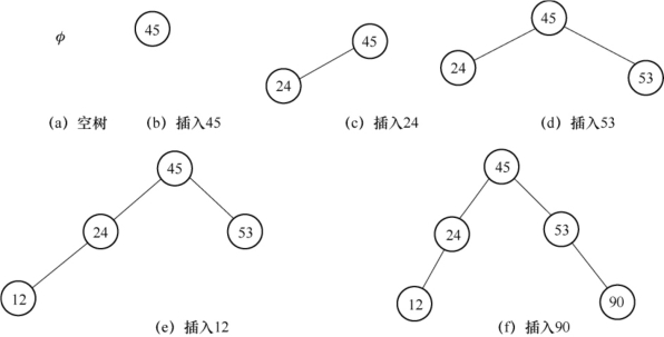 若从空树出发,经过一系列的查找插入操作之后,可生成一棵二叉树。设查找的关键字序列为{45,24,53,45,12,24,90},则生成的二叉排序树如图9-4所示。