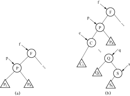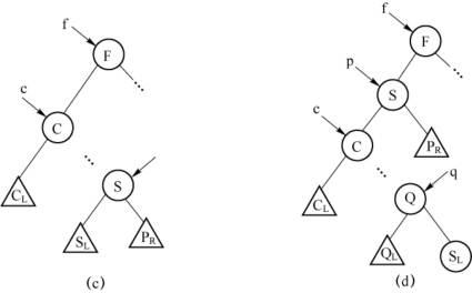 (3)若*p结点的左子树和右子树均不空。显然,此时不能加上简单处理。从图9-5(b)可知,在删去*p结点之前,中序遍历该二叉树得到的序列为{…CLC…QLQSLSPPRF…},在删去*p之后,为保持其他元素之间的相对位置不变,可以有两种做法:其一是令*p的左子树为*f的左子树,而*p的右子树为*s的右子树,如图9-5(c)所示;其二是令*p的直接前驱(或直接后继)替代*p,然后再从二叉排序树中删去它的直接前驱(或直接后继)。如图9-5(d)所示,当以直接前驱*s替代*p时,由于*s只有左子树SL,则在删去*s之后,只要令SL为*s的双亲*q的右子树即可。