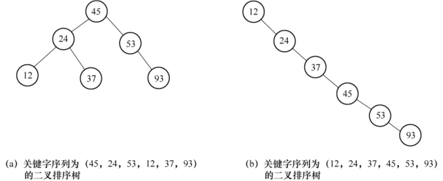 从前述的两个查找例子(key=100和key=40)可见,在二叉排序树上查找其关键字等于给定值的结点的过程恰是走了一条从根结点到该结点的路径的过程,和给定值比较的关键字个数等于路径长度加1(或结点所在层次数),因此,和折半查找类似,与给定值比较的关键字个数不超过树的深度。然而,折半查找长度为n的表的判定树是唯一的,而含有n个结点的二叉排序树却不唯一。图9-6中(a)和(b)的两棵二叉排序树中结点的值都相同,但前者由关键字序列(45,24,53,12,37,93)构成,而后者由关键字序列(12,24,37,45,53,93)构成。图9-6(a)树的深度为3,而图9-6(b)树的深度为6。再从平均查找长度来看,假设6个记录的查找概率相等,为1/6,则图9-6(a)树的平均查找长度为