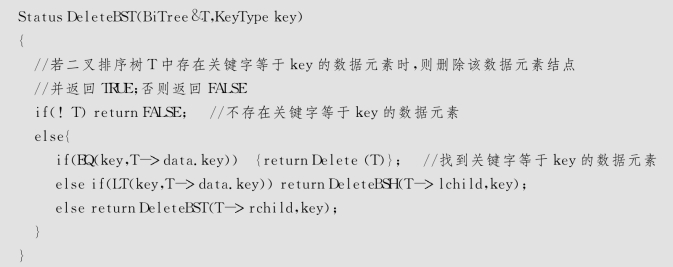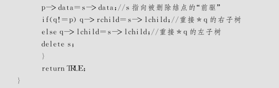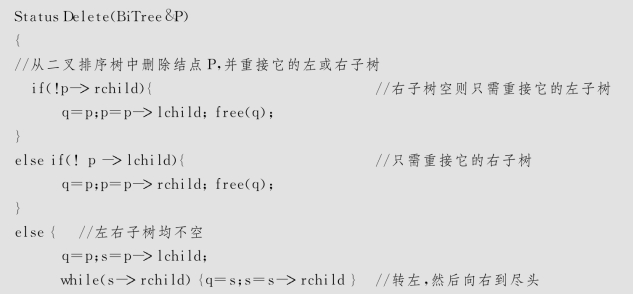 在二叉排序树上删除一个结点的算法如算法9.5所示,其中由前述三种情况综合所得的删除操作如算法9.6所示。