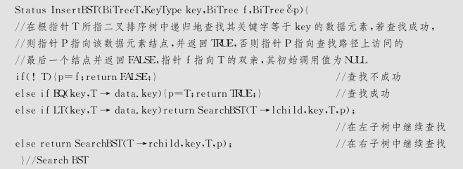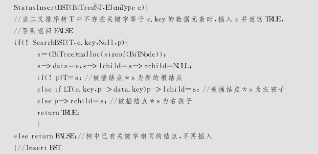 二叉排序树是一种动态树表,其特点是,树的结构通常不是一次生成的,而是在查找过程中,当树中不存在关键字等于给定值的结点时再进行插入。新插入的结点一定是一个新添加的叶子结点,并且是查找不成功时查找路径上访问的最后一个结点的左孩子或右孩子结点。为此,需将上一个节的二叉排序树的查找算法改写成算法9.3(b),以便能在查找不成功时返回插入位置。插入算法如算法9.4所示。
