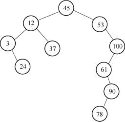 例如,在图9-3所示的二叉排序树中查找关键字等于100的记录(树中结点内的数均为记录的关键字)。首先以key=100和根结点的关键字作比较,因为key>45,则查找以45为根的右子树,此时右子树不空,key>53则继续查找以结点53为根的右子树,由于key和53的右子树根的关键字100相等,则查找成功,返回指向结点100的指针值。
