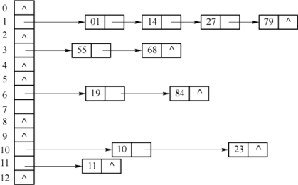 例9-1 已知一组关键字为(19,14,23,01,68,20,84,27,55,11,10,79),则哈希函数H(key)=key MOD 13和链地址法处理冲突构造所得的哈希表如图9-9所示。