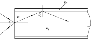 8.图2-14所示是一根圆柱形光纤,光纤芯的折射率为n1,光纤包层的折射率为n2,并且n1>n2。①证明入射光的最大孔径角2u满足关系式:
