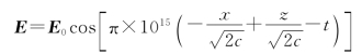 32.一平面简谐电磁波在真空中沿z轴正向传播,其频率为6×1014 Hz,电场振幅为42.42V/m,如果该电磁波的振动面与xOz平面成45°角,试写出E和B的表达式。