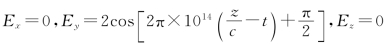 式中E0=10x+10y,c为光速,x和y为x、y轴的单位矢量。①求光波的波长和频率;②求光波的偏振方向和传播方向;③在x=0的平面上光束遇到折射率为n=1.5的玻璃,对透镜到玻璃中的光波重求前两问。