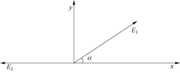9.如图2-15所示,光束E1=E10cos(kz+ωt)和E2=E20cos(kz-ωt)的电矢量方向之间的夹角为α,且有E10cosα=-E20。①两光束叠加形成的合光束是什么类型的光束?②求合光束的电矢量表达式。③求合光束的光强。