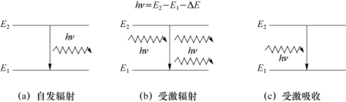 在外来辐射场的诱发下,原子吸收光子从低能级跃迁到高能级,这一过程被称为受激吸收。3种不同的辐射跃迁过程如图9-2所示。