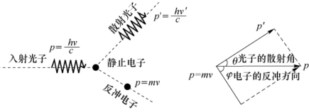 经过单色化的X射线入射到不同的材料上,在散射光中,一部分波长不变,另一部分波长变长,这种有波长改变的散射称为康普顿散射。光子与电子的弹性碰撞如图9-1所示。