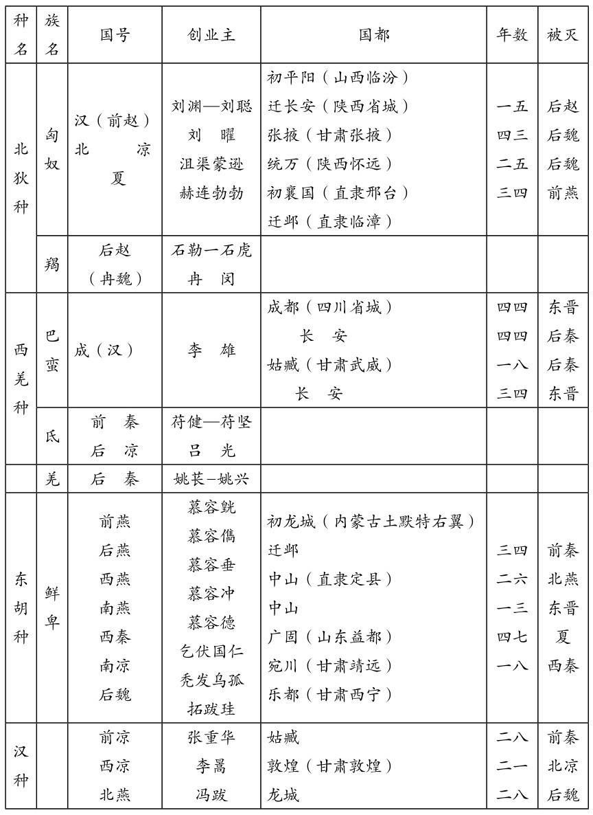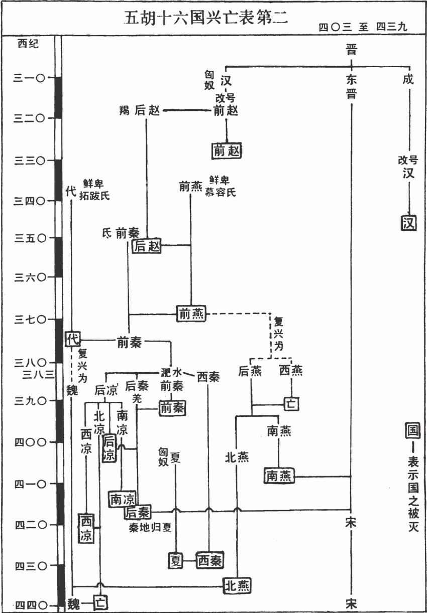 自《史记》创立十表,开著作家无量法门,郑樵《图谱略》益推阐其价值。《史记》惟表年代、世次而已,后人乃渐以应用于各方面。如顾栋高之《春秋大事表》,将全部《左传》事迹重新组织一过,而悉以表体行之,其便于学者滋多矣。即如五胡十六国之事,试一读齐召南之《历代帝王年表》,已觉眉目略清,若更为下列之两表,则形势若指诸掌矣。今录举以为例: