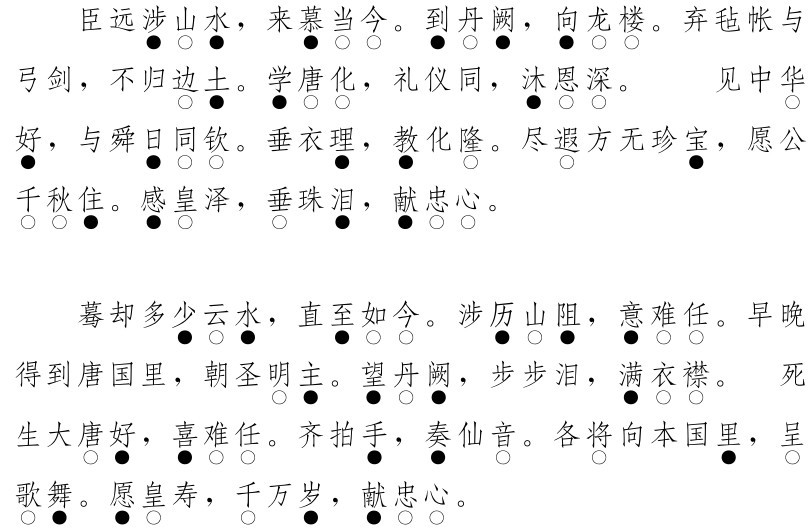 敦煌曲子词里保存了不少早期的长短句形式的歌词,例如唐明皇的御制曲子 《献忠心》见于教坊曲,它在盛唐时期已经传播西北。今敦煌曲子词里存 “御制”两首,另存西北民族将领表示归向大唐意愿的两词: