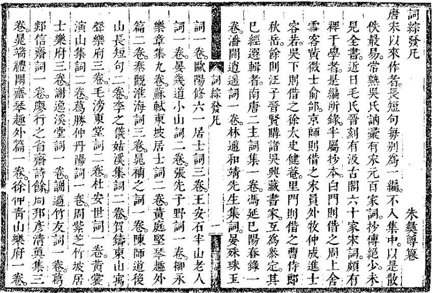 用长短句制乐府歌辞,由汉迄南北朝皆然。唐初以诗被乐,填词入调则自开元、天宝始。逮五代十国,作者渐多,遗有 《花间》《尊前》《家宴》等集。宋之初,太宗洞晓音律,制大小曲及因旧曲造新声,施之教坊舞队,曲凡三百九十,又琵琶一器有八十四调。仁宗于禁中度曲时,有若柳永;徽宗以大晟名乐时,则有若周邦彦、曹组、晁次膺、万俟雅言。皆明于宫调,无相夺伦者也。洎乎南渡,家各有词,虽道学如朱仲晦、真希元亦能倚声中律吕,而姜夔审音尤精。终宋之世,乐章大备,四声二十八调,多至千余曲,有引、有序、有令、有慢、有近、有犯、有赚、有歌头、有促拍、有摊破、有摘遍、有大遍、有小遍、有转踏、有转调、有增减字、有偷声。惟因刘昺所编 《宴乐新书》失传,而八十四调图谱不见于世,虽有歌师板师,无从知当日之琴趣、箫笛谱矣……盖昔贤论词,必出于雅正,是故曾慥录《雅词》,鲖阳居士辑 《复雅》也。