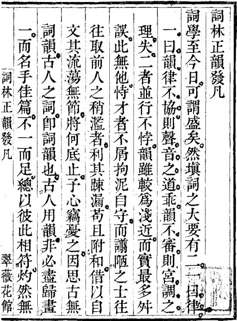 元明以来,词学衰息,迨本朝万氏 《词律》出,而后人知词不可无律,然万氏只取诸名家之词排比以求其律,而律之原固未之知也。戈顺卿氏踵其后,视万氏所得有进矣;乃戈氏深于律而不工于词,读其词者惜焉。夫律之不知,固不足言词,而词之不工,又何以律焉。