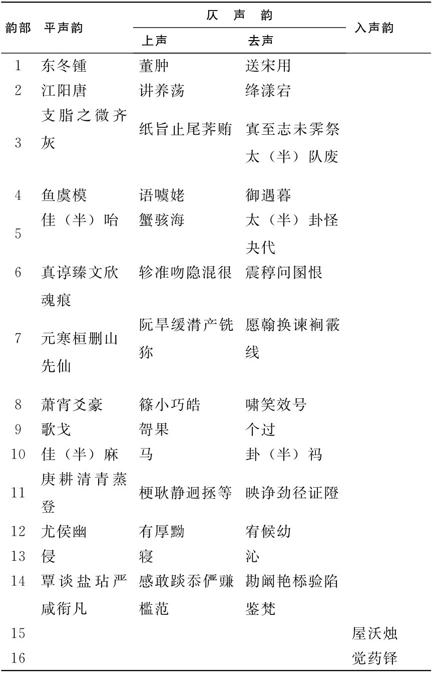 (二)词韵与诗韵的区别。戈载认为:“词韵与诗韵有别,然其源即出于诗韵”;“词韵较之诗韵虽广,要各有界域。”他认识到词韵是源于诗韵而有所变化,因此不能以诗韵代替词韵。词韵虽然用韵较宽,但某些规律又是比诗韵更复杂的。据此,戈载对词韵的编排便以通用诗韵 (主要依据 《集韵》兼参照 《广韵》)的韵目字为准,韵部的分别则按照宋人用韵的实际而加以总结,体现了词韵的特殊性。