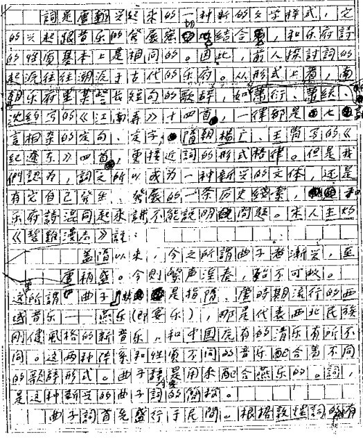词的起源,只能这样说:唐玄宗的时代,外国乐 (胡乐)传到中国来,与中国古代的残乐结合,成为一种新的音乐。最初只是用音乐来配合歌辞,因为乐辞难协,后来即倚声以制辞。这种歌辞是长短句的,是协乐有韵律的——是词的起源。[10]
