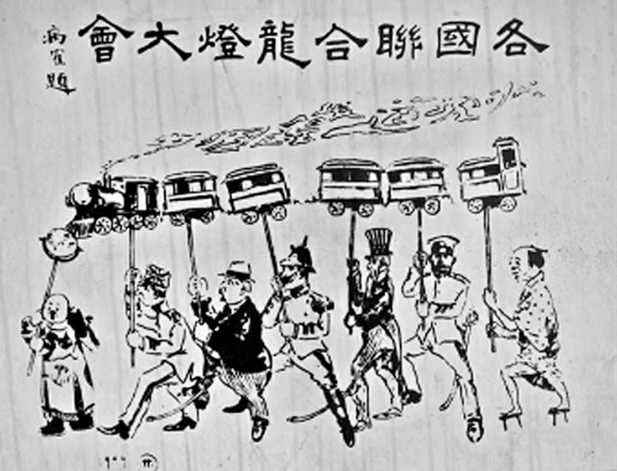 1909年 《民呼日报》 刊登漫画, 揭露西方列强联合掠夺中国铁路。 图中的龙灯象征中国铁路, 举龙灯者为英、 法、 德、 美、 俄、 日等
