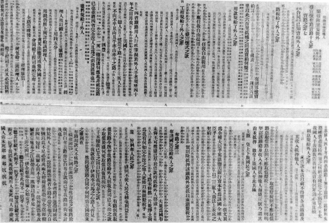 (五)川汉铁路并非干路,“原约并无四川在内”,要求“皇上俯念民依,仰承先朝钦颁法律,将四川川汉铁路照常暂归商办,一切议事用人勿任邮传部妄加干涉”。