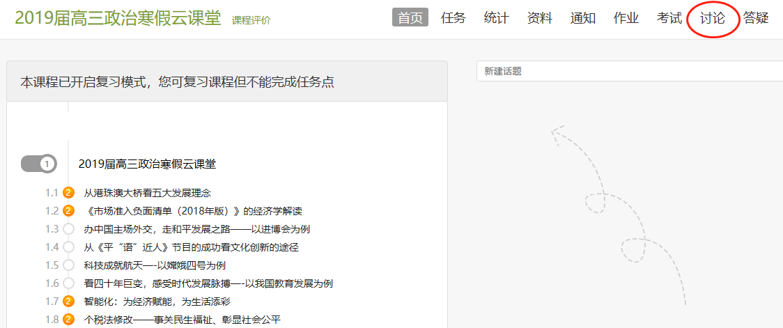 进入课程学习页面后,空间课程后,在课程首页功能导航菜单区域点击“讨论”按钮(如下图红圈处),进入相关课程的讨论模块和提问,可以与老师和学习同伴进行在线交流。