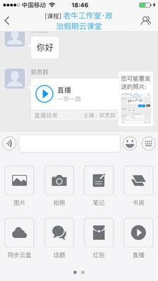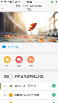 老师或者学生点击默认班级群聊按钮,就可以整个选择这门的学生可以进行互相讨论、视频解答、通知等。老师也可以在规定一个时间点进行视频在线辅导,解惑所有学生的疑问。