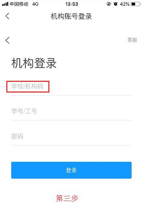 第三步:输入登录信息,学校/机构码一栏,先输入学校名称关键字,在下拉菜单中会出现学校全称,选择自己所在学校即可;学号/工号即PC登录账号,与网页版登录账号一致。