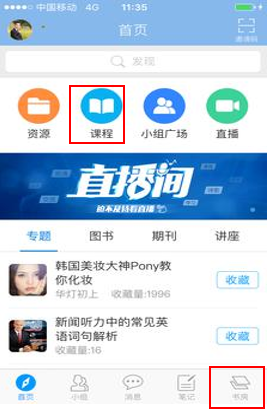 点击书房或课程按钮(如右图红色框处),即可进入我的课程,查看自己选学的课程。此时可以点击自己所选的课程进入学习。