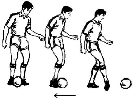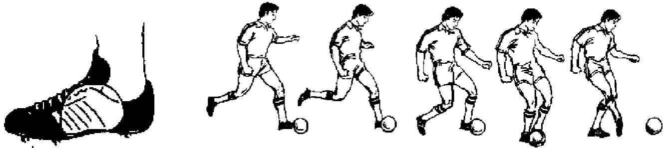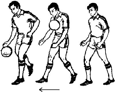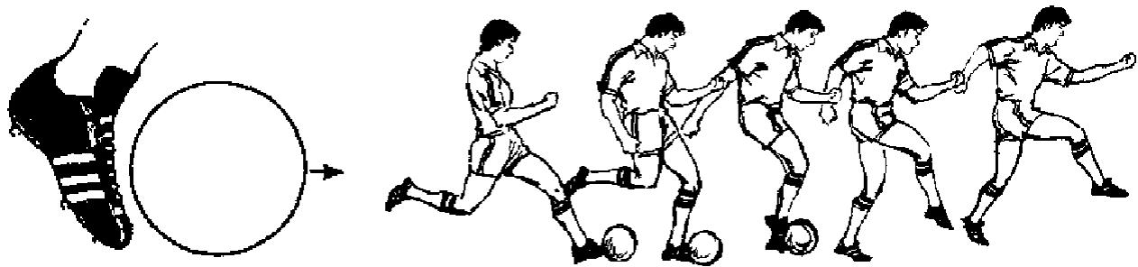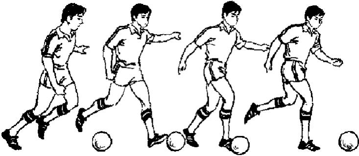 2)脚内侧运球。运球时,支撑脚稍向前跨,踏在球的前侧方,膝稍弯曲。上体前倾向里转。随着身体向前移动,运球脚提起,用脚内侧推球的后中部(图2-42)。