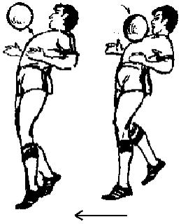 原地前额正面顶球:身体正对来球,两脚前后开立,膝关节微屈,上体稍后倾,重心在后脚上,两臂自然张开,两眼注视来球。当球运行到身体垂直部位前的一刹那,后脚用力蹬地,重心移至前脚,同时迅速向前摆体,颈部紧张,迅速甩头,前额正面顶球的后中部,上体随球继续前摆(图2-40)。