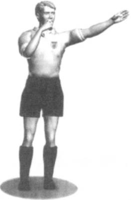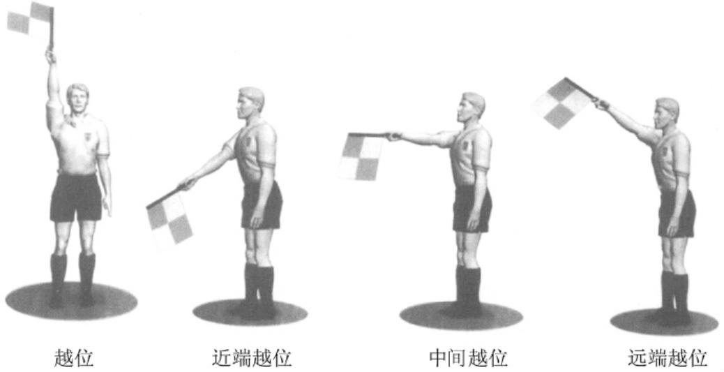 4)越位——上举,裁判员鸣哨后指向越位地点(图2- 59)(近端——斜下伸,中间——前平举,远端——斜上举)。