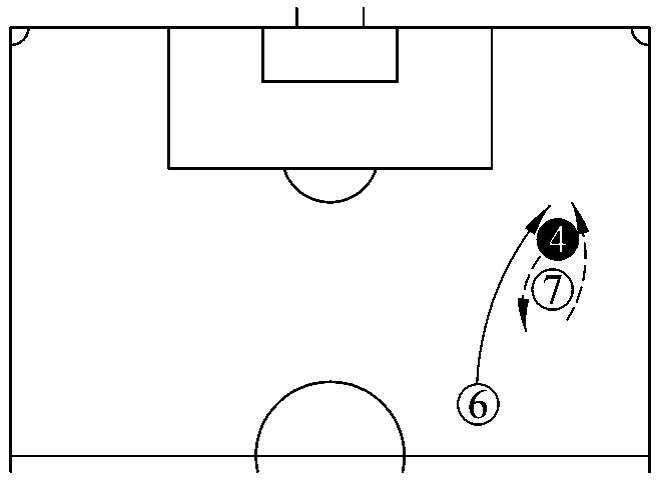 摆脱示例(图2-48):反切,⑦号向东侧跑去准备接⑥号的传球,把防守队员❹号引诱出来,再突然转身切入,摆脱❹号的防守,这种自己给自己制造空当的方法,对一个跑得快的前锋来说,发挥技术和速度是比较有利的。