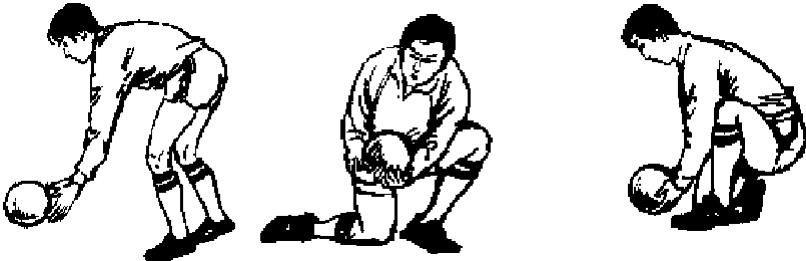 2)接地滚球。分为直腿和单腿跪撑式两种。在直腿接球时,两腿自然并立,脚尖正对来球,上体前屈,两臂迎接来球(图2-46)。