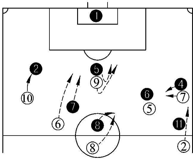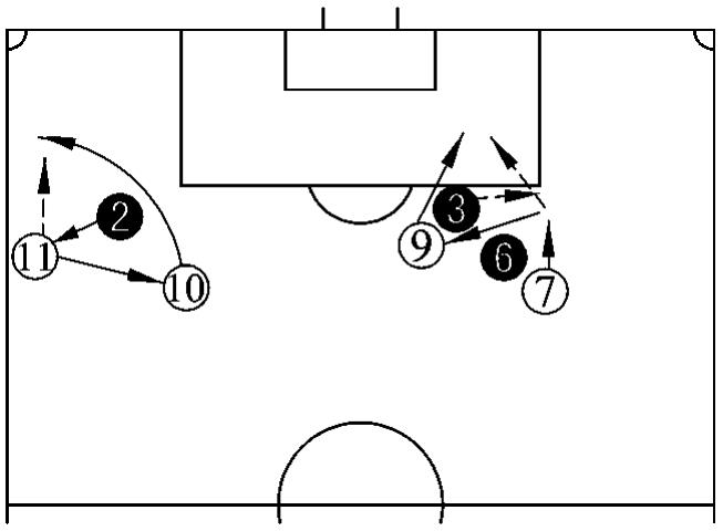 1)斜传直插二过一(图2-50):⑪号斜回传给⑩号,⑩号斜线传球,⑪号直线插入接球。⑦号运球越过❻号横传给⑨号,⑨号向前斜传,⑦号直线插入接球。